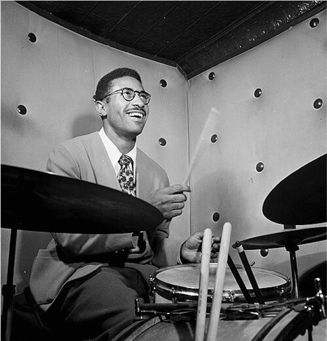 Max Roach radio. On Saturday of this weekend, WKCR-FM in New York will be celebrating drummer Max Roach’s birthday by playing his music for 24 hours (ET). You can tune in from anywhere in the world by going here. [Photo above of Max Roach in 1947 by William P. Gotfried]