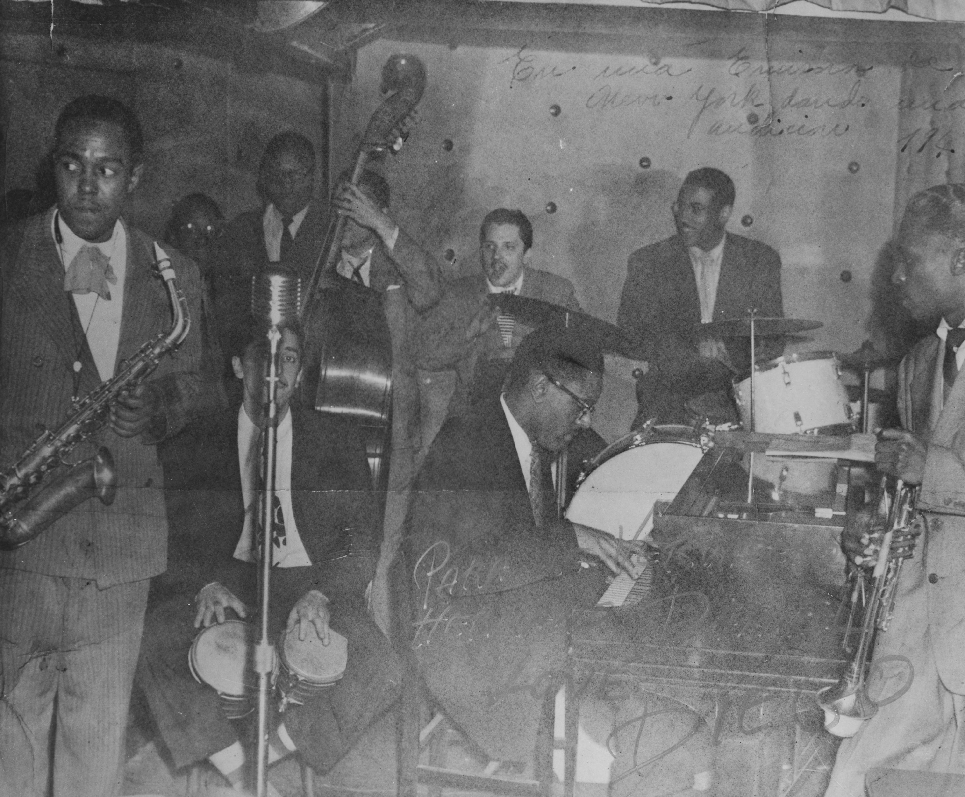 Charlie Parker. My friend, painter Nelson Diaz, sent along this rare photo of the Charlie Parker Quintet at New York’s Three Deuces in the late 1940s. From the left, Charlie Parker on alto saxophone, Dani Perez on bongos, Tommy Potter on bass, Carlos Vidal Bolado on congas, Duke Jordan on piano, Max Roach on drums and Miles Davis on trumpet.