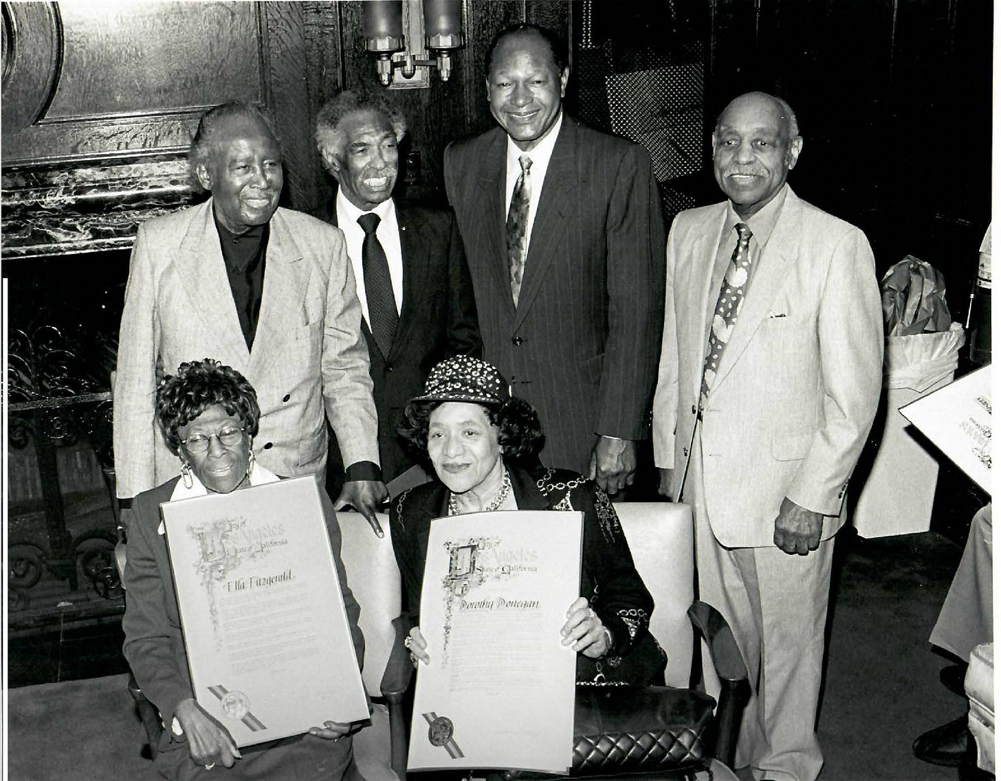 “Hi Marc. See the attached photo above. Both she and trumpeter Harry “Sweets” Edison were part of the first group of Los Angeles-based NEA American Jazz Masters honored by Mayor Tom Bradley on April 27, 1992. Benny Carter, Ella Fitzgerald and Gerald Wilson were the other honorees. [Pictured above, clockwise, from the bottom right, Dorothy Donegan, Ella Fitzgerald, Harry "Sweets" Edison, Gerald Wilson, then-Los Angeles Mayor Tom Bradley and Benny Carter.]