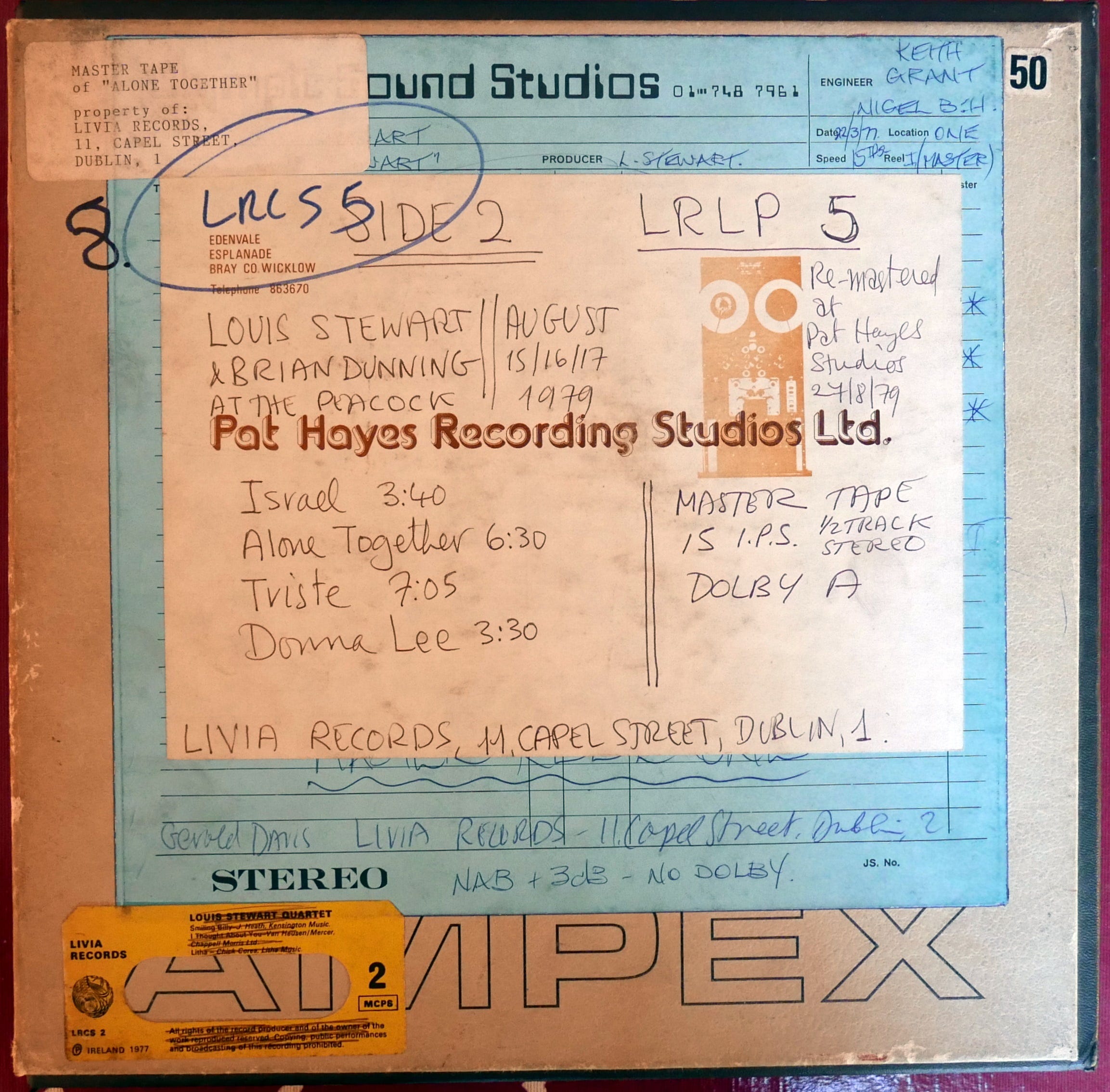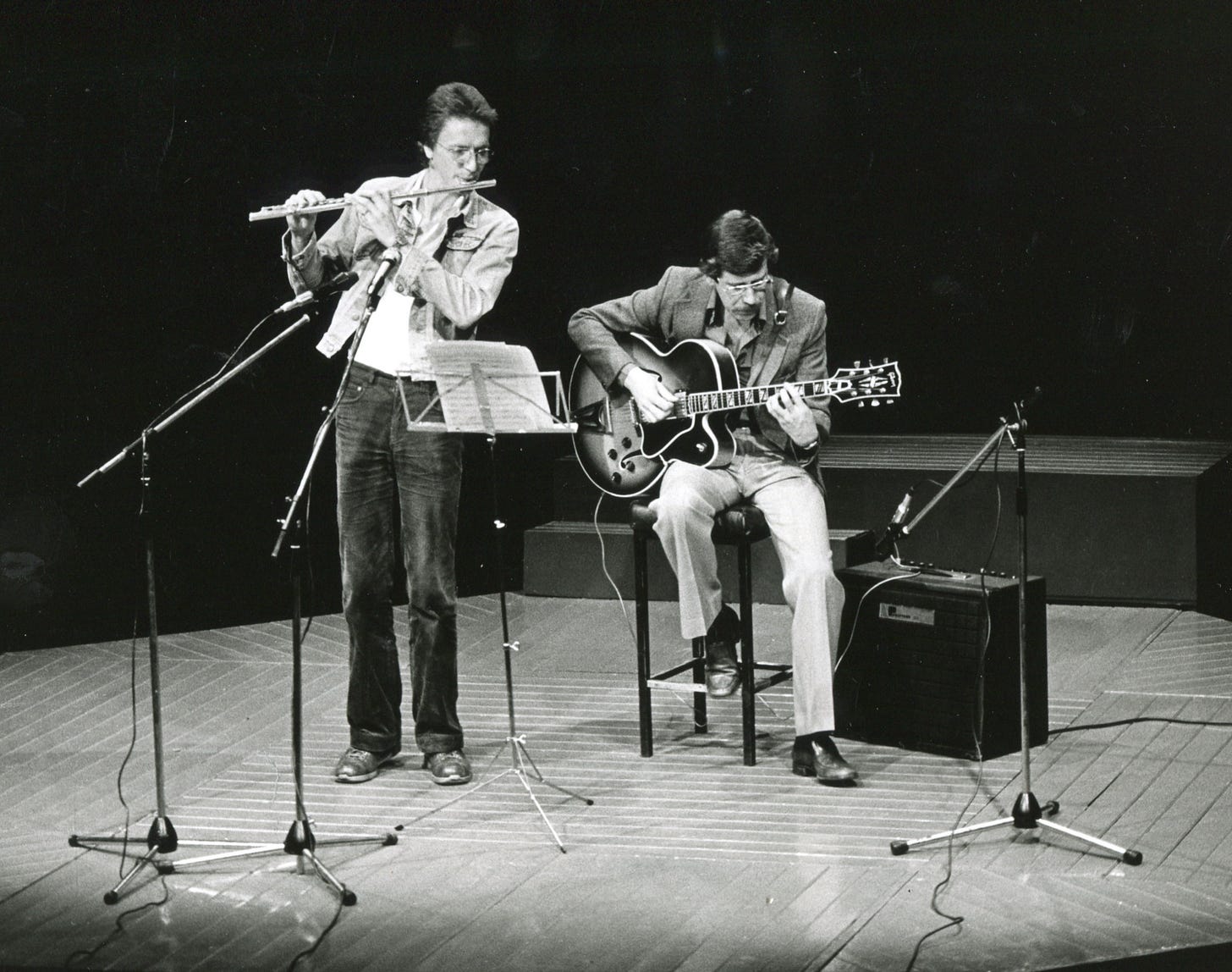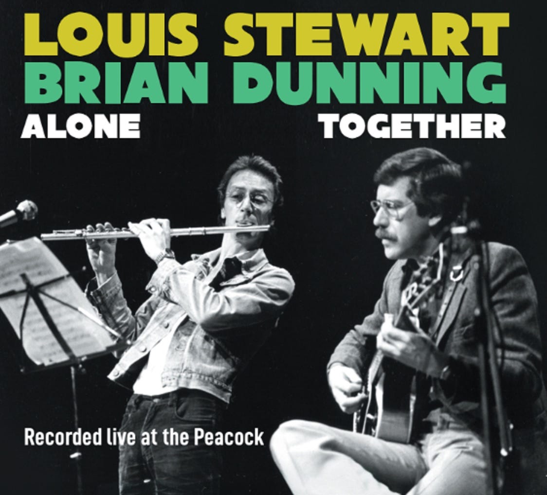 On August 15, 16 and 17 in 1979, Irish jazz guitarist Louis Stewart and flutist Brian Dunning performed three sold-out lunchtime concerts at Dublin’s Peacock Theatre. We now have Alone Together, the remastered recording in crystal clear audio from Livia Records, Ireland’s first jazz label. [Photo of Louis Stewart and Brian Dunning on stage at Dublin’s Peacock Theatre]